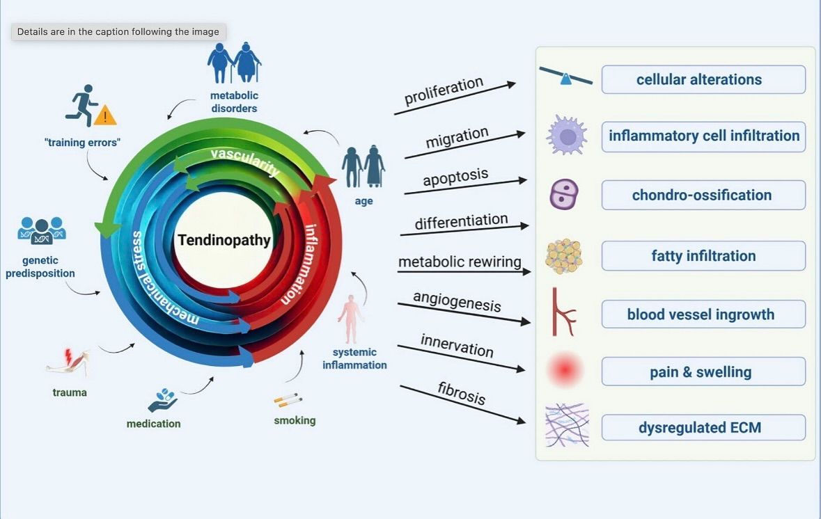 Tendon Dysrepair: If the tendon continues to be overloaded without enough rest, it moves into "failed healing." The internal structure becomes more disorganized, and the body may start growing extra blood vessels and nerves in the area to try to fix it, making the tendon more sensitive.